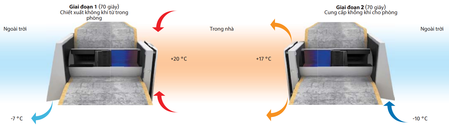 Quá trình cấp khí tươi hồi nhiệt hoạt động theo 2 giai đoạn trên, mỗi giai đoạn 70 giây. Việc này diễn ra liên tục giúp cho môi trường sống và làm việc của bạn luôn được bảo đảm.